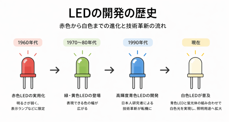 LEDの歴史は意外と古く、1960年代に赤色LEDが初めて実用化されました。当初は明るさが弱く、電子機器のインジケーター(表示ランプ)など限られた用途にしか使われていませんでした。