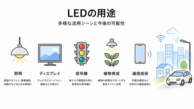その他にも、信号機、医療機器、植物育成用ライト、さらには通信技術(可視光通信)など、LEDはさまざまな分野で活用されています。