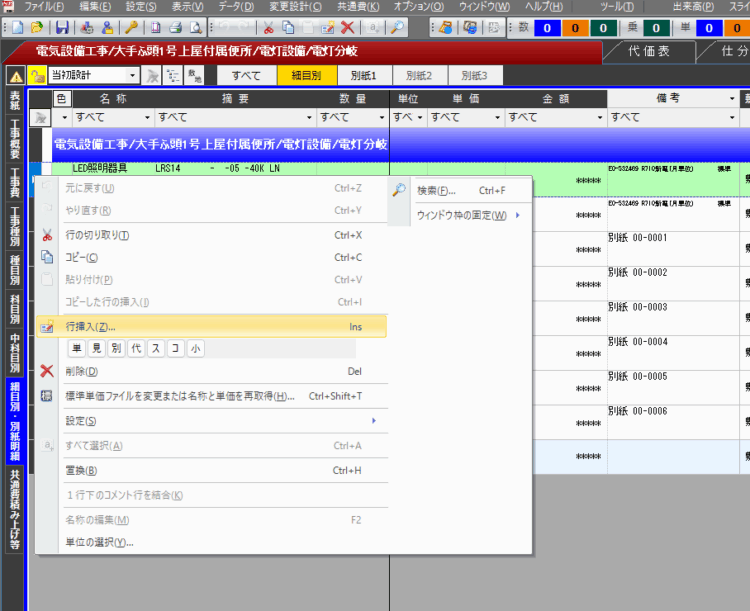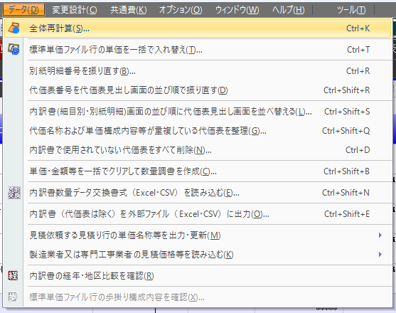 上のメニューにある「データ」から、「代価表番号を…」「別紙明細番号を…」を選択すると