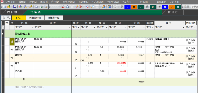 単価ファイルに登録されていない資材を入力する際は代価表を作成します。