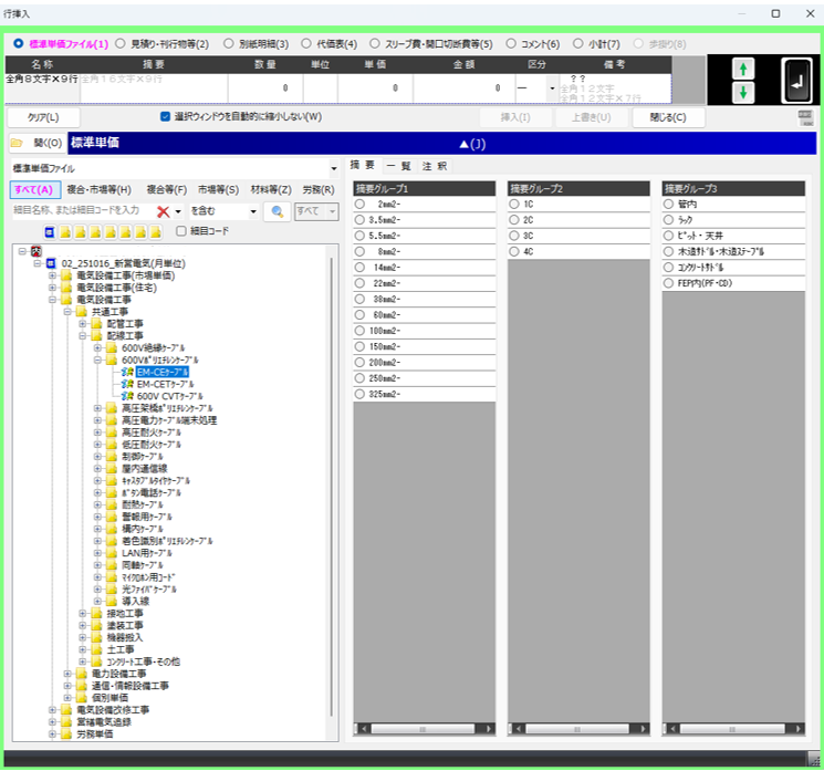 登録されていない資材は見積行(見積り・刊行物等)で入力し、労務単価は単価ファイルより